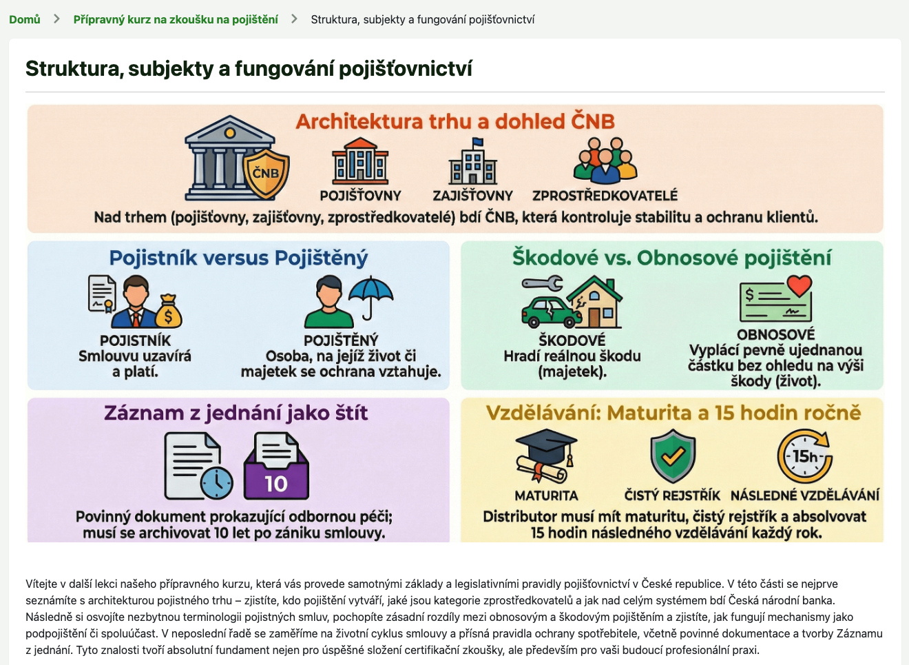 🧠 Pochopení místo biflování: Neučte se tisíce otázek nazpaměť. Vysvětlíme vám logické souvislosti (vznik smluv, pojistné zájmy, specifika rizik), abyste správnou odpověď vždy sami odvodili.